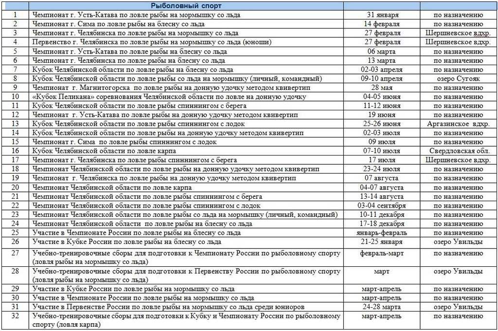 Календарный план Свердловской области 2016 на сайте минспорта Добавлено спустя 26 минут 4 секунды: Мормышка. 17 января - Кубок Екатеринбурга + Первенство среди юношей Виз 28 января -1 февраля Кубок России Воронеж 6-7 февраля Кубок СО + Первенство среди юношей Рефт 15-21 февраля Чемпионат Мира Украина 10-14 марта Чемпионат России Углич 24-28 марта Первенство России юноши Увильды 2-3 апреля Чемпионат СО Сысерть или Макаровское или Черноисточинск декабрь 2016 Чемпионат Екатеринбурга Добавлено спустя 3 минуты 47 секунд: Донная ловля. 5-9 мая Кубок России Воронеж 11-12 июня Чемпионат СО Кушва 7-11 июля межрегиональные Алтай 18-22 августа Чемпионат России Краснодар август Чемпионат Екатеринбурга гор.пруд 3-4 сентября Кубок СО Ревда Добавлено спустя 3 минуты 10 секунд: Поплавок. 12-15 мая Кубок России Краснодар 5 июня Чемпионат Екатеринбурга гор.пруд 25-26 июнь Кубок СО 9-10 июля Курган кубок Бабкиных Тобол 4-8 августа Чемпионат России 27-28 августа Чемпионат СО |